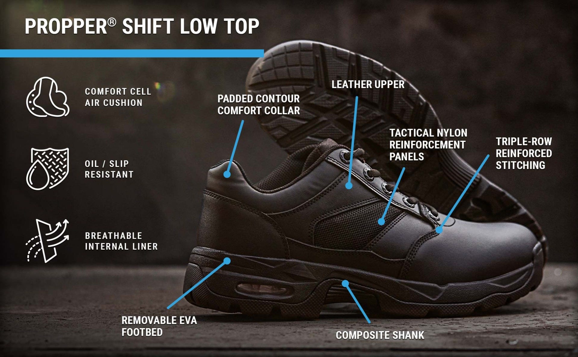 The Shift Low Top helps you stay comfortably on your feet until the job is done. Engineered using true US sizing for superior fit with excellent weight distribution for all-day comfort The new Shift Low Top is built on an EVA rubber outsole for excellent traction and impact absorption, removable EVA contoured footbed for added comfort, breathable lining, padded ankle collar, composite shank for extra support, and leather upper construction with double and triple stitching for longer wear.